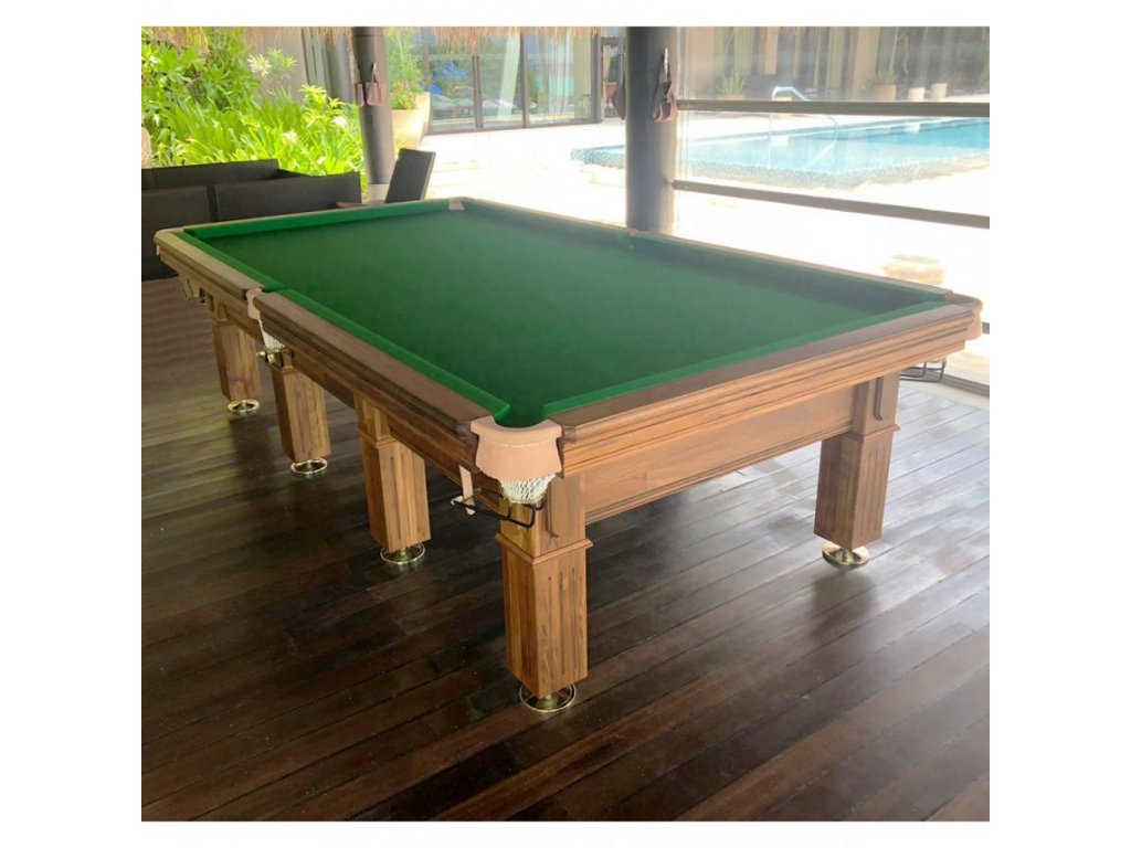 - Snookerové stoly se vyrábí pouze s masivní konstrukcí z masivního dřeva. S osmi robustníma nohama pro zvýšení stability velké hrací plochy a téměř tunové zátěže díky silným břidlicovým deskám. Mantinely jsou kovové, až poté se instaluje gumový mantinel. Sjezd koulí z kožených kapes je prováděn za pomoci postranních pojezdů. Samozdřejmostí jsou také postranní držáky pro příslušenství. Konstrukce jsou složité, každá deska váčí cca 150 kg a je nutné je perfektně vyvážit, proto doporučujeme odbornou montáž a dopravu, kterou Vám poskytneme společně s potažením.