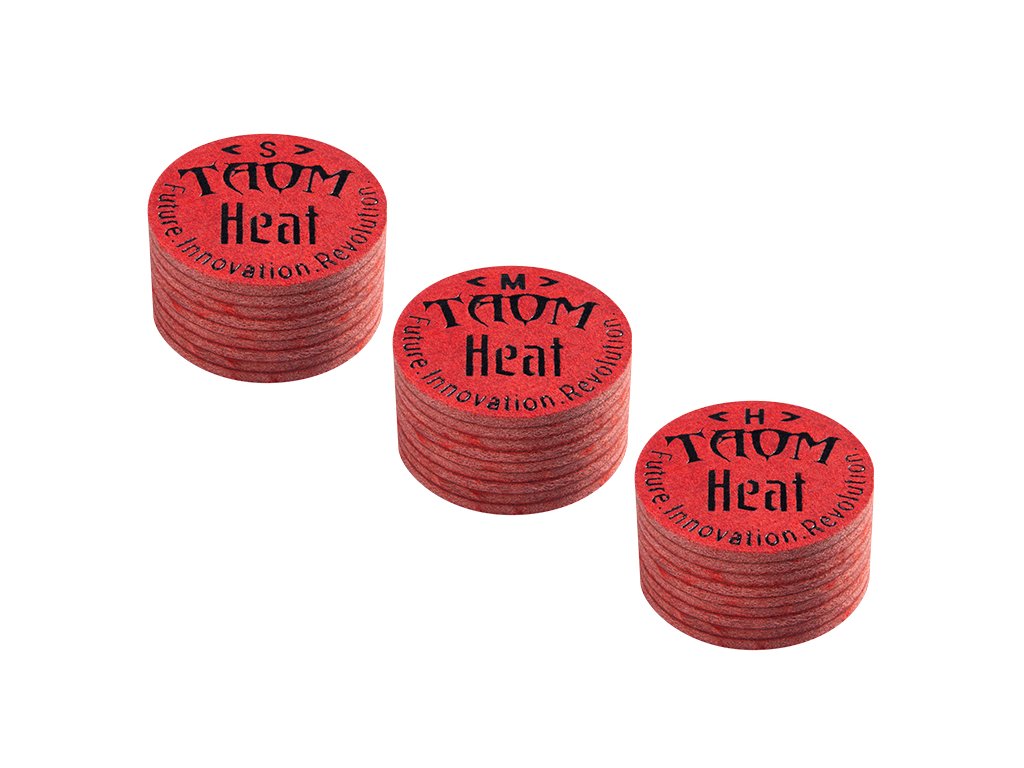 Taom Heat inovativní kůže na kulečníkové tágo od firmy Taom, navržená pro maximální kontrolu a konzistentní odezvu díky své vícevrstvé konstrukci z vepřové kůže, dostupná v tvrdostech Soft, Medium a Hard, která nabízí precizní kontakt, minimalizuje prokluz a je vhodná pro všechny styly hry, od power shots po maximální spin.